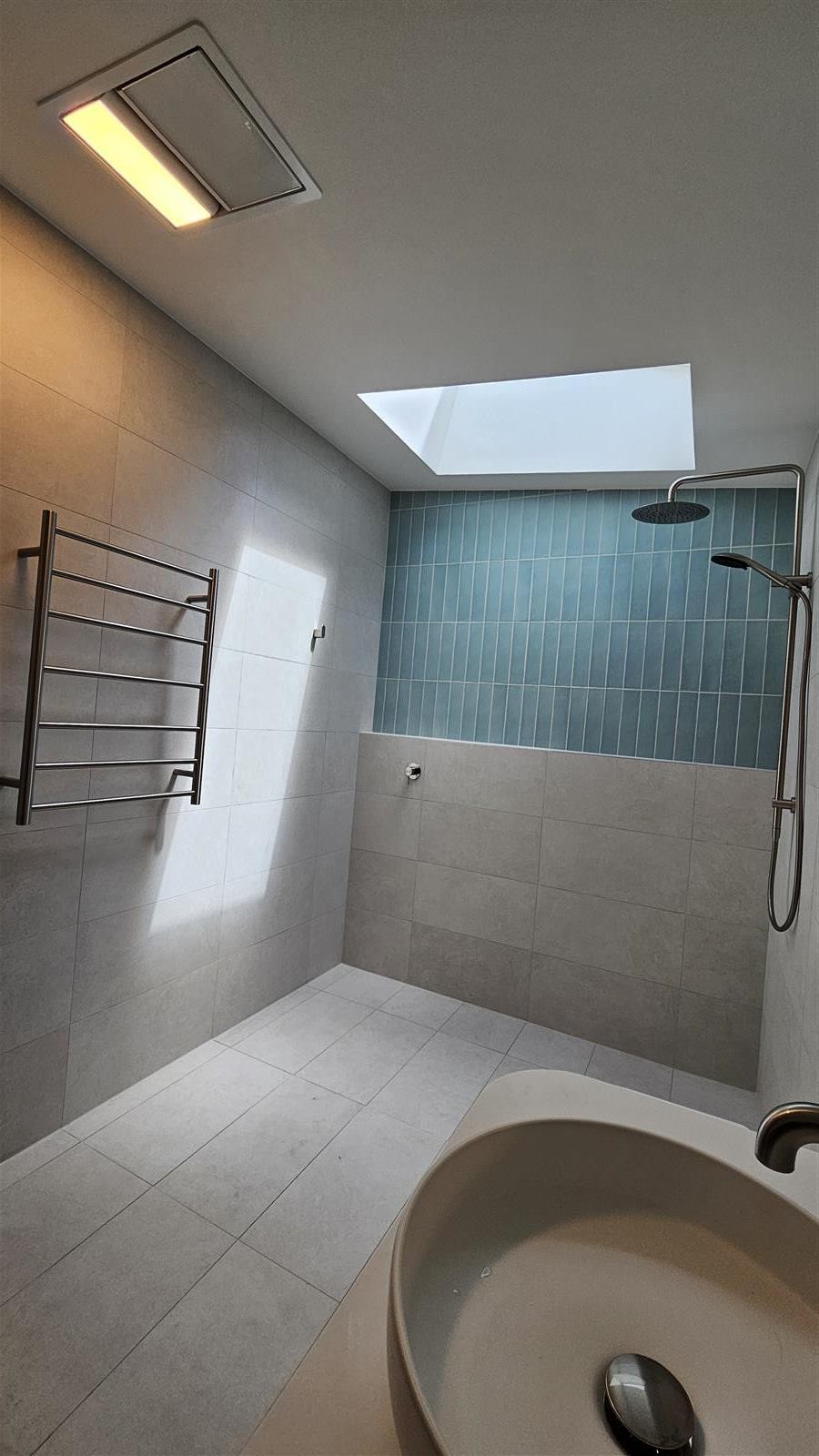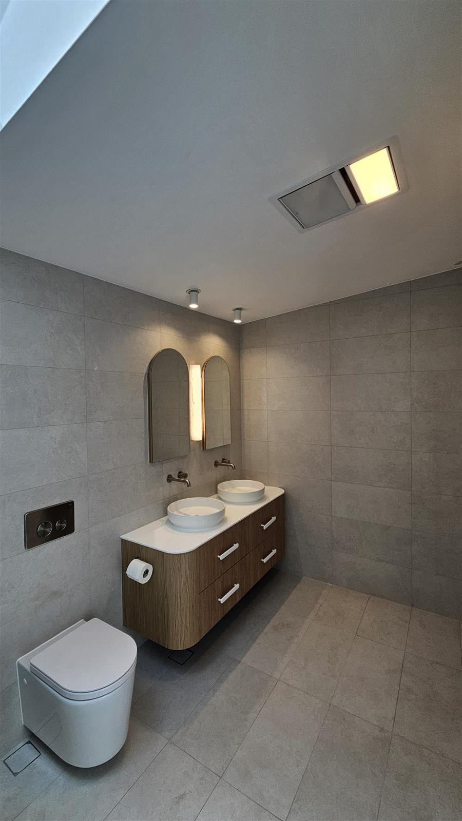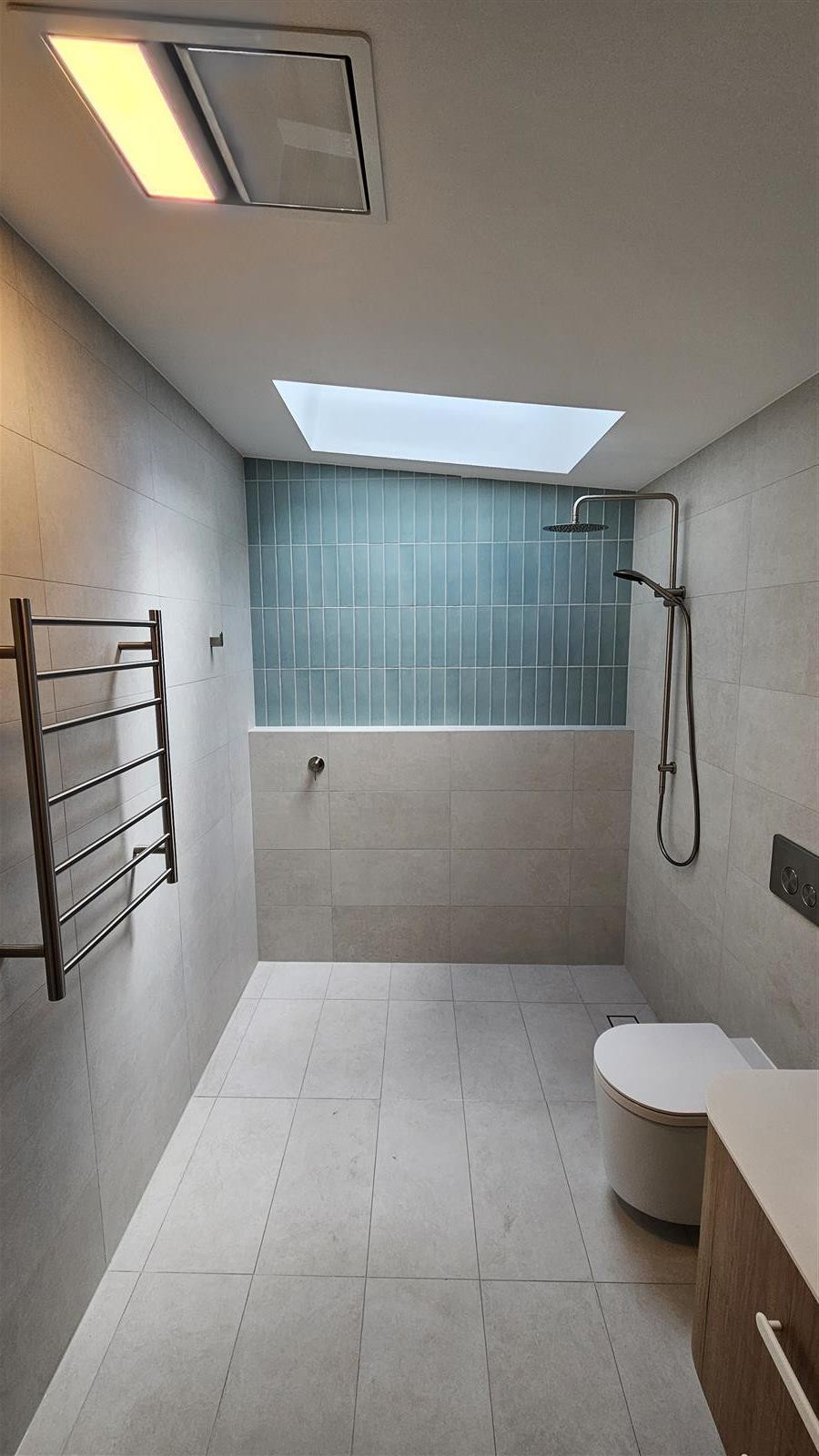 A light-filled ensuite renovation with a calm, modern feel. Soft-toned tiles, clean-lined fixtures and subtle colour accents combine with thoughtful lighting to create a functional and inviting space with a refined finish.