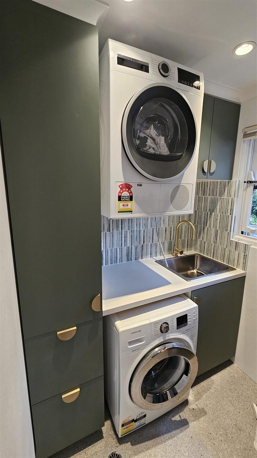 A clean, contemporary renovation featuring a compact water closet and a practical laundry space. Soft neutral tiles, streamlined cabinetry and warm metallic accents create a cohesive, modern look that balances functionality with refined design.