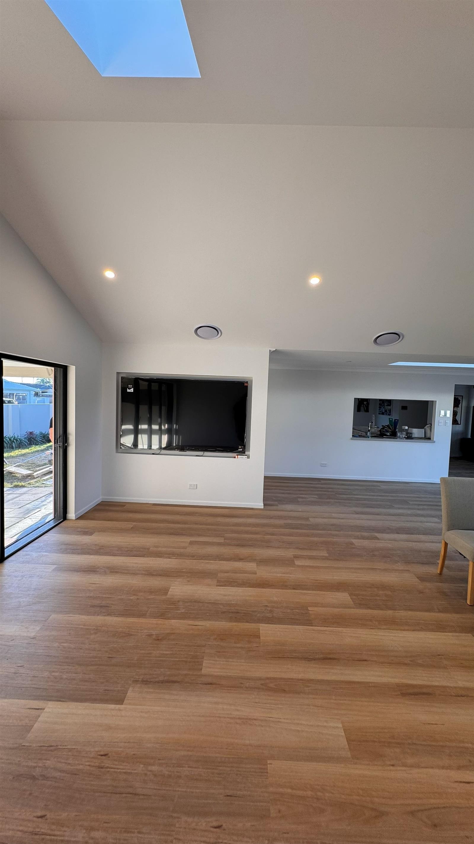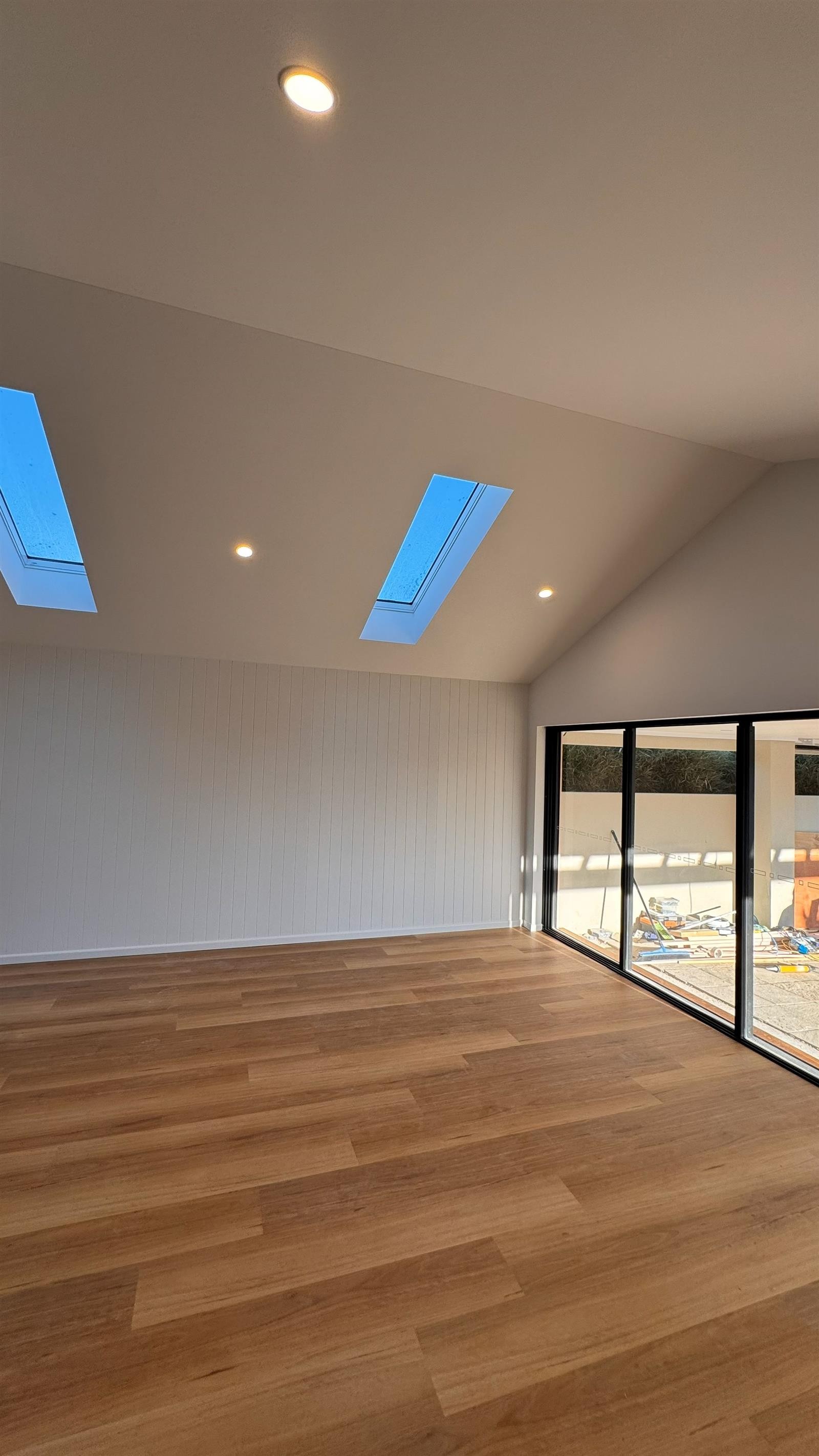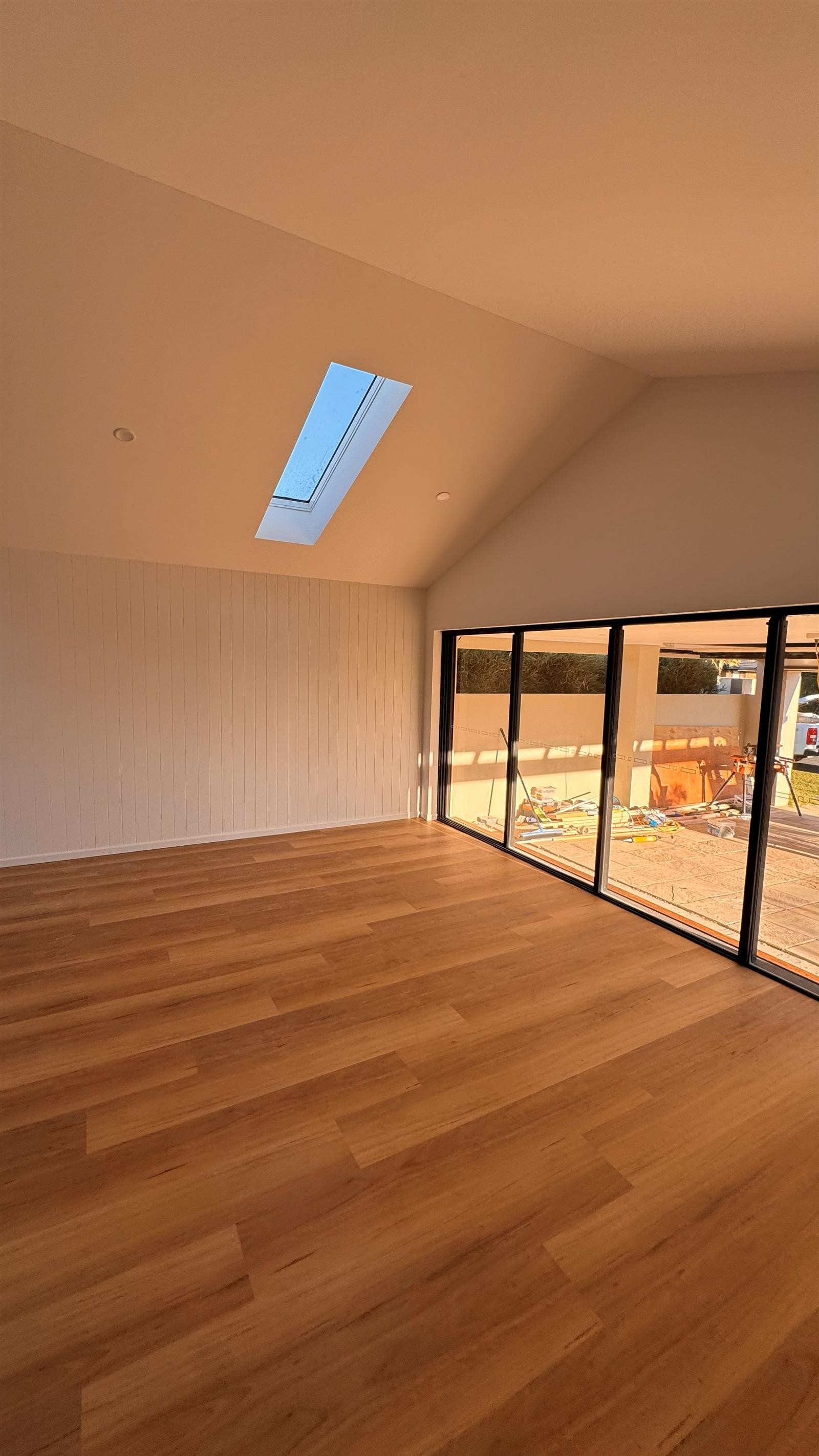The unused old brick garage and detached rumpus room inspired a fresh approach. By joining this area to the main house, we were able to extend the hallway, open up the floorplan and create a much larger living and dining zone. This required a full rebuild of the space, including demolition, a new slab, new framing and a hand pitched raked roof that lifted the ceiling height to around five metres. This allowed for angled Bradnams windows, a commercial size corner stacker and two skylights, filling the new area with natural light. The entire roof, including the existing house, was replaced with Colorbond Surfmist, and the external cladding was a mix of James Hardie Axon Smooth and Scyon Linear. Internally, Gyprock walls were finished with a VJ feature wall to add warmth and texture.