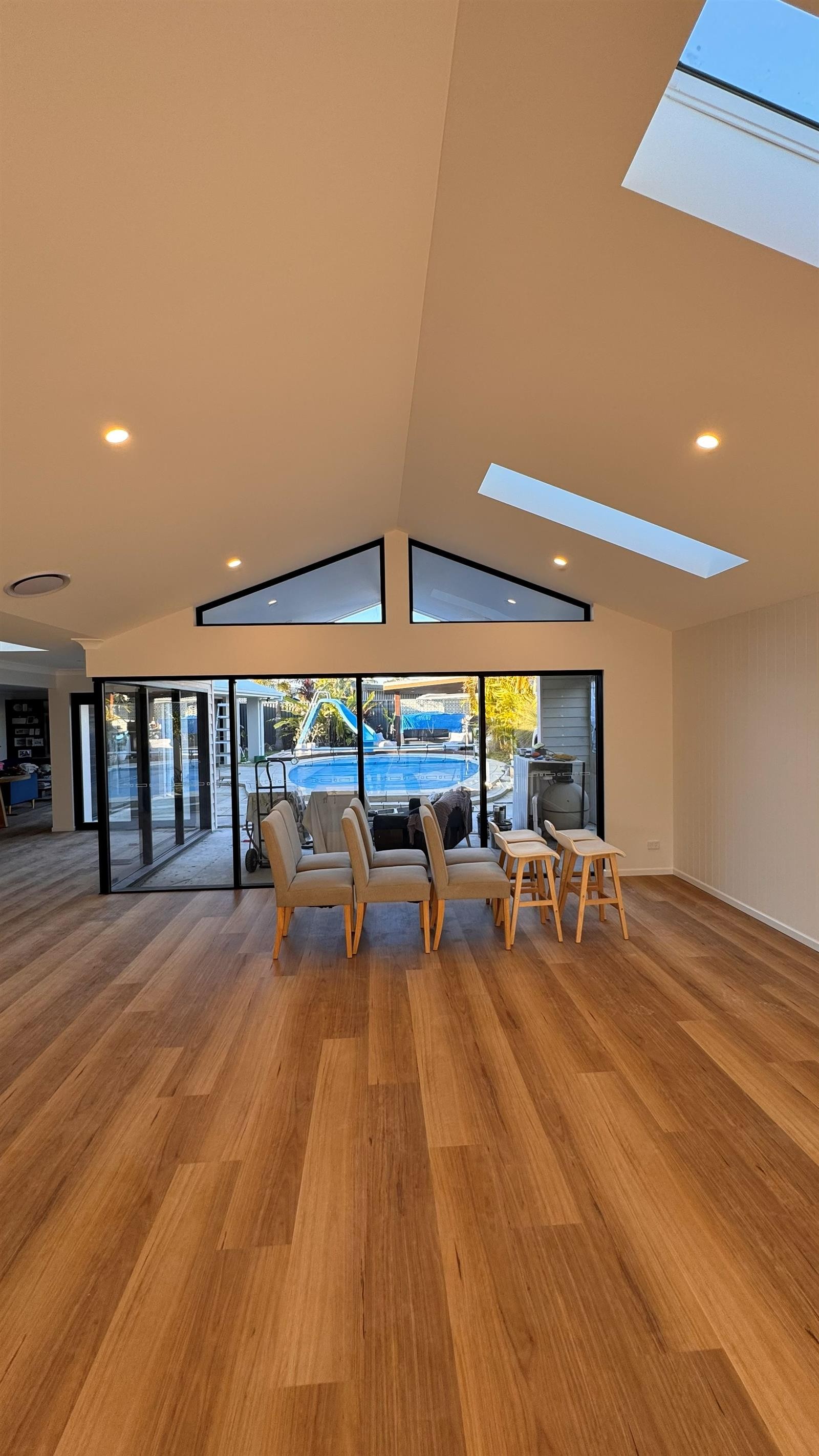 The completed space feels open, airy and inviting. The high ceilings, raked windows, corner stacker and skylights combine to create a stunning connection to the outdoors and a living area that suits the family perfectly.